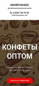 | AI-анализ | The web project "Конфетки.БЕЛ" is an online distributor of bulk confectionery items for sale in Belarus. The site offers optome imports and exports of candies and confectionery products with delivery across Belarus. The company is the first distributor of factories such as Славянка, Бабаевский, Красный Октябрь, РотФронт, Невский Кондитер, Микаелло, Коммунарка, and Спартак in Belarus and represents these factories officially. The extensive inventory includes a wide range of confectionery items such as tea and coffee, chocolate, caramel and lollies, pastries, and marshmallows. Customers can view the product catalog and prices, and place orders for delivery. |