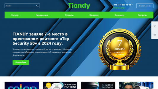 | AI-анализ | This online resource is the official partner of Tiandy in Belarus. It offers a wide range of products for video surveillance from Tiandy, including IP cameras, IP video recorders, and accessories, as well as server solutions. Stock is available, and customers benefit from a manufacturer's warranty. The website also invites potential partners to collaborate with Tiandy, providing technical support via phone at +375 (17) 270-15-15, +375 (29) 370-15-15, and +375 (25) 770-15-15, or by email at info@tiandy.by. The catalog features IP video cameras from series AK, Spark, Superlite, Lite, Pro, Project, WiFi, PTZ, AEW, Panorama, Pro, |
