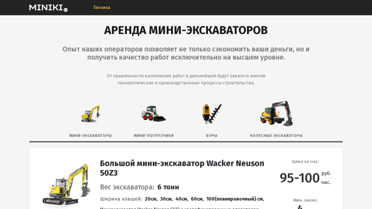 | AI-анализ | The portal Miniki.by offers rental services for construction equipment in Minsk. The range of equipment includes mini-excavators, mini-loaders, bulldozers, and a large mini-excavator from Wacker Neuson. Each piece of equipment comes with experienced operators to ensure high-quality work, which is crucial for subsequent technological and production processes in construction. Mini-excavators and mini-loaders come in various sizes with different bucket widths, ranging from 20cm to 120cm for planning purposes. The Wacker Neuson 50Z3 mini-excavator weighs 6 tons and is available for rent at a rate of 95-100 rubles per hour with a minimum rental period of 4 hours. Another mini-excavator, the Kobelco SK30SR, weighs 3 tons and can |