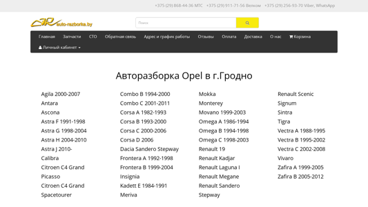 | SEO-описание | Крупнейшая авторазборка Opel в Гродно. Широкий ассортимент оригинальных запчастей, гарантия низкой цены. |