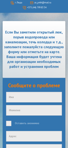 | Адрес | г. Лиды и Лидского района возможности сообщения о проблемах, связанных с эксплуатацией систем водоснабжения и водоотведения. |