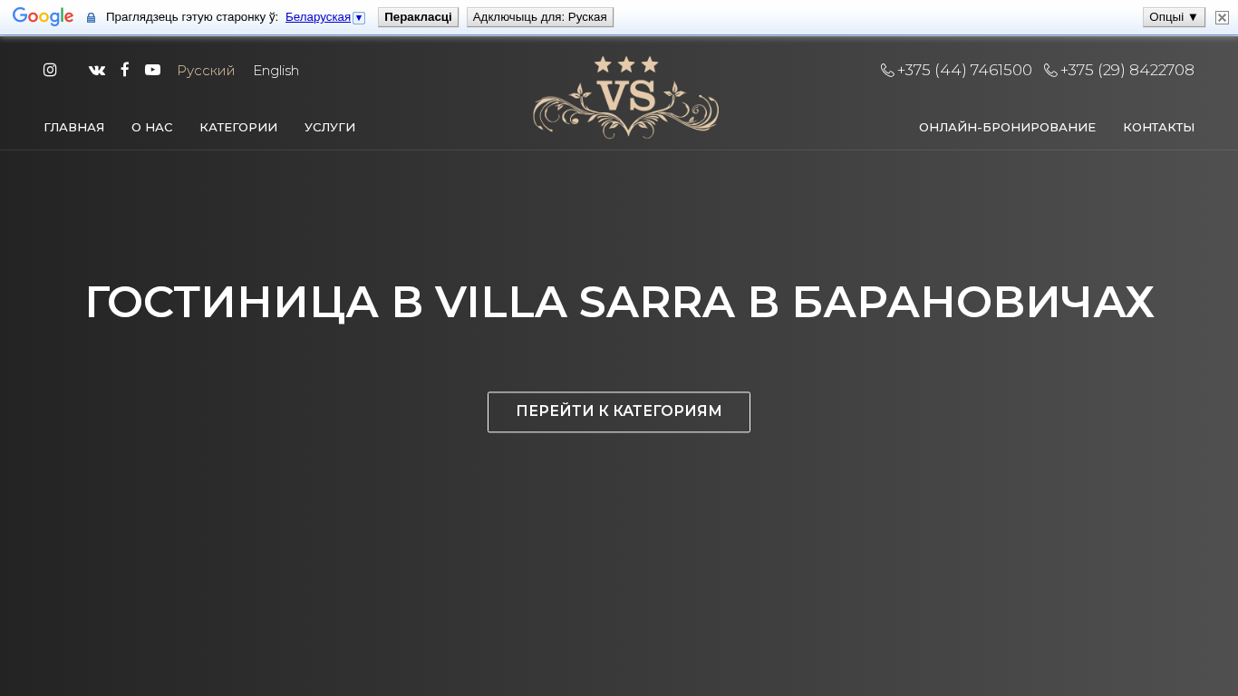 | SEO-описание | Гостиница VILLA SARRA в Барановичах. Положительные отзывы✓ Высокие рейтинги✓ Уютные номера✓ Частная парковка✓ Wi-Fi✓ Зеленая зона✓ Вкусные завтраки✓ Наличный и безналичный расчет✓ Бронь ☎ +375 (44) 746-15-00 |