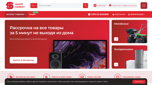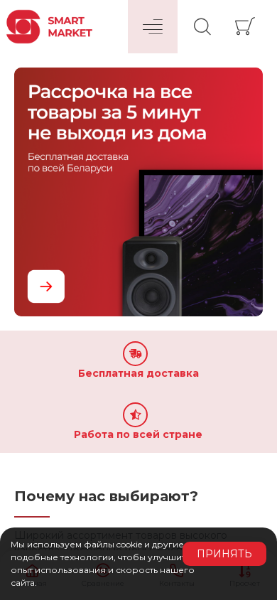 | AI-анализ | This website is an online marketplace selling various electronics and home appliances. The title and description of the site are "Smart Market." The keywords associated with the site include " Smart Market," "televisions," "notebooks," "gaming consoles," "refrigerators," "washing machines," "microwave ovens," "cookers," "electric scooters," "electric motorbikes," "motoblocks," and "comparison." The top words on the site are "без," which means "without," and "рассрочку," which means "installment payment." Users can find products in several categories, including "Televisions," "Notebooks," "Gaming Consoles," "Refrigerators," "Washing Machines," "Microwave Ovens," "Cookers," "Electric Scooters |