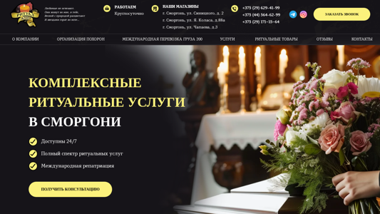 | AI-анализ | --- The portal Ritual Elit offers a full range of funeral services and related products in Sморгони, Oшмянах, and Островце. The company provides international transportation services and consultations for document preparation for burial and repatriation. The high-quality products are produced in-house and include a wide selection of coffins, wreaths, and other items. A special transport is used for secure transportation of deceased persons. The organization is available 24/7 for funeral arrangements upon loss of a family member or close acquaintance. Services include summoning emergency services by phone (103 for an ambulance, 102 for the police), and contacting the funeral agency via one of the provided phone numbers: +375 (29) 629−41−99, +375 (29) 35 |