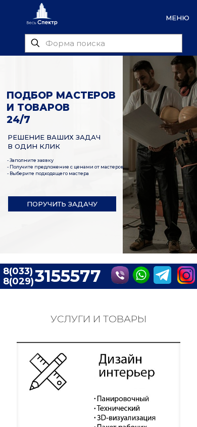 | AI-анализ | --- This website is for the organization 'Весь Спектр' in Vitebsk, offering repair and construction services. The main sections include construction, bathrooms, foundations, roofing, fencing, canopies, gates, and kovans. Services include interior design, repair and finishing, tensioned ceilings, plumbing, electrical work, and floor levelling. The site also features a master-on-call service and an online marketplace, VSMARKET.BY, for purchasing various goods with delivery across Belarus. The online marketplace offers over 7,000 items, with discounts on many products from partners. The site includes customer testimonials, and the company prides itself on employing experienced specialists and offering unique, discounted products. |
