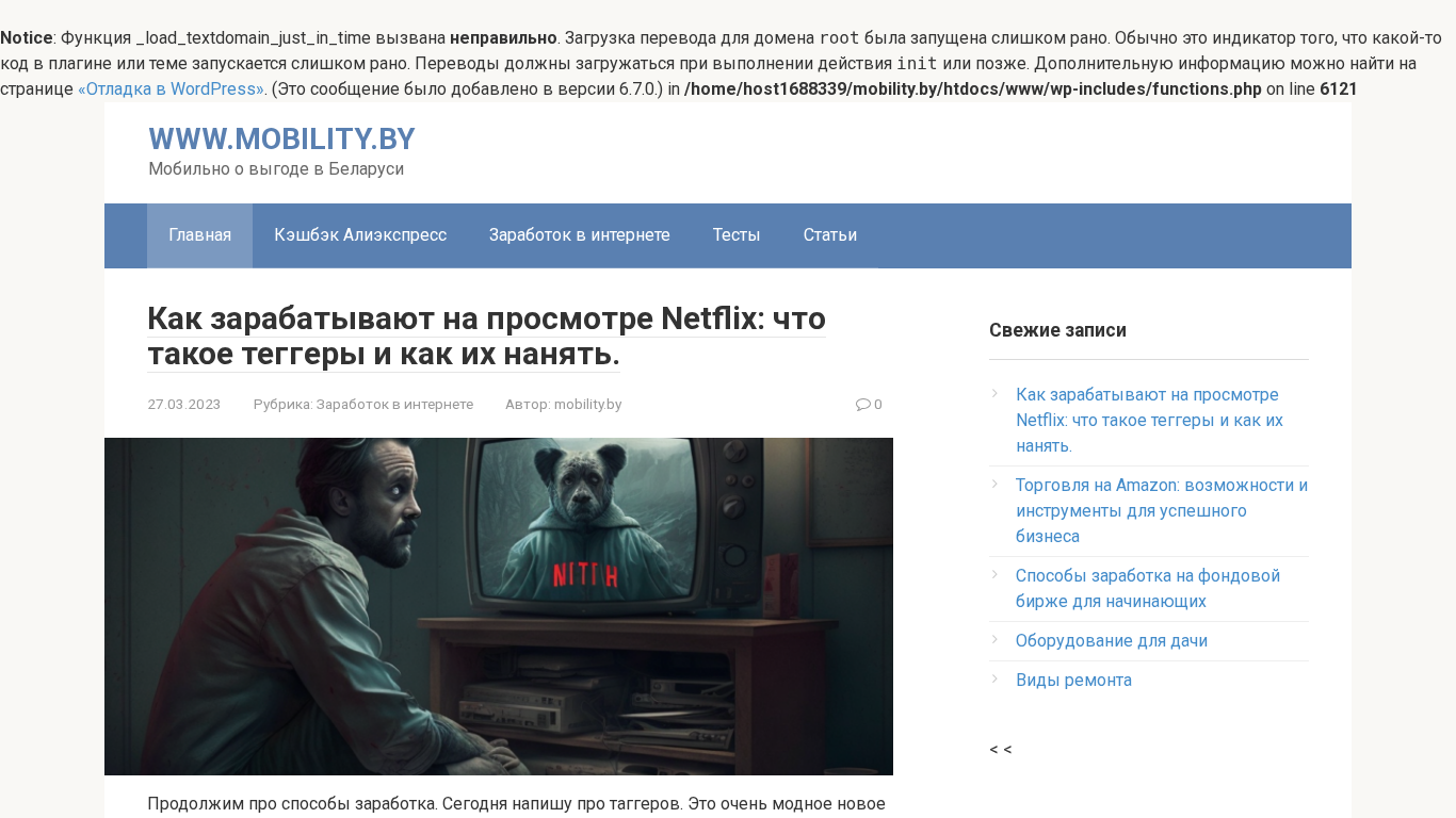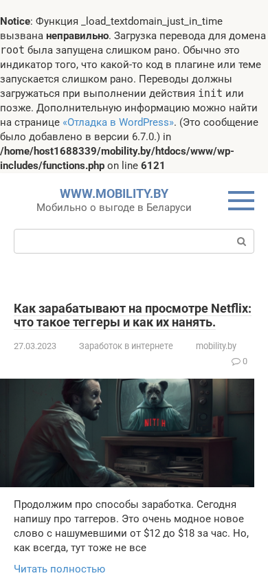 | AI-анализ | The website "Мобильно о выгоде в Беларуси. Зарабатываем на дому в кризис" (mobility.by) is a Belarusian blog focusing on making money in Belarus. The author personally tests various methods of earning money online, with categories including cashback, Amazon sales, and stock trading for beginners. The site includes articles such as "Как зарабатывают на просмотре Netflix: что такое теггеры и как их нанять" and "Торговля на Amazon: возможности и инструменты для успешного бизнеса." The website was last updated on March 27, 2023, with the latest article being about taggers in online money-making. The site also includes a section for studies and is written in Belarusian. A notice |