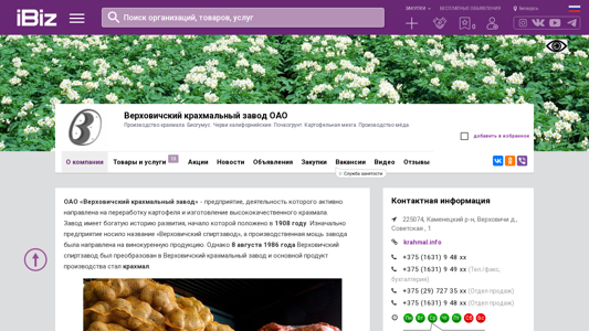 | AI-анализ | This website is for the Verhoвичsky Krakhmalny Zavod OAO, a Belarusian company specializing in the production of potato starch (krahmal) and other related products. The company's history dates back to 1908 when it was established as a distillery, but was later transformed into a starch factory in 1986. The main products include various types of potatoes, potato starch, biogumus (organic fertilizer made from earthworms), potting soil, and potato puree. The company also deals with timber processing. The website provides information on the company, its products, and contact details. Keywords: potato, starch, factory, production, biogumus, fertilizer, potting soil, potato puree, timber. |