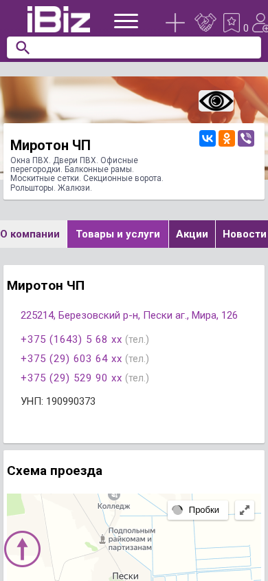 | Название / Заголовок | Миротон ЧП - Окна ПВХ. Двери ПВХ. Офисные перегородки. Балконные рамы. Москитные сетки. Секционные ворота. Рольшторы. Жалюзи.. 225214, , Пески аг., Мира, 126 |