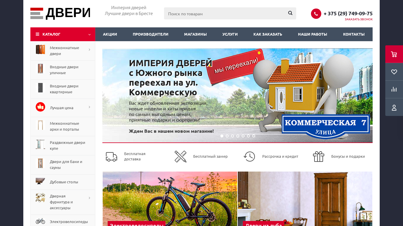 | SEO-описание | Сеть магазинов входных и межкомнатных дверей в Бресте и Брестской обл. Качественные двери разных стилей и ценовой категории! Доставка, рассрочка, установка. |