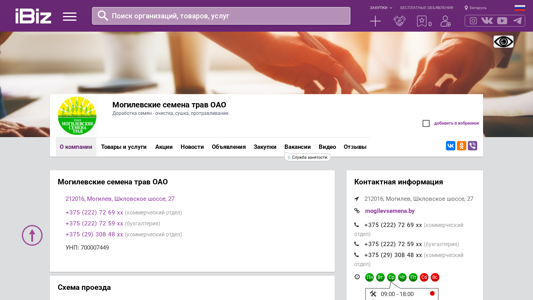 | AI-анализ | The portal mogilevsemena.ibiz.by is a business website belonging to Могилевские семена трав ОАО, an organization located in Могилев, Belarus, with the address Шкловское шоссе, 27. The company specializes in the processing of seeds, including cleaning, drying, and treatment. Keywords associated with the website include 'semena,' 'rasssada,' 'посадочный материал,' 'закупки,' 'объявления,' and 'могилевские.' The website offers information on the company's products and services, as well as contact details, including phone numbers for the commercial and accounting departments. The opening hours are from 09:00 to 18:00, Monday to Friday, with Saturdays and Sundays being holidays. The company is listed under the |