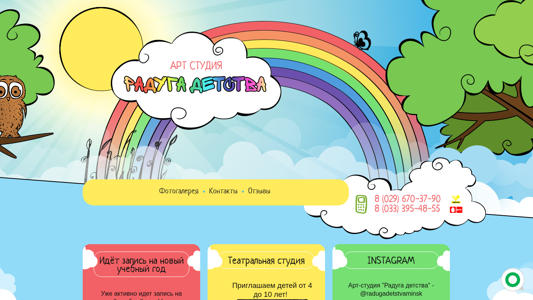 | AI-анализ | The web project "Rainbow of Childhood. Art-therapy studio. Painting Center for Early Childhood Development Rainbow Childhood" is located in Sereбряnka, Minsk. The website focuses on art therapy, children's painting studio, and early childhood development center. The project offers various artistic activities for children from 1 to 10 years old. The main goal is not to teach children specific artistic skills, but rather to foster their creativity and desire to create. The studio offers two groups: Creative Masterclass for children aged 3.5 to 7 years, and the Art School for children aged 7 to 10 years. The Creative Masterclass includes artistic experiments using various materials and techniques. The Art School focuses on the basics of academic drawing, painting, and composition for children. The website provides contact information, including phone numbers for Velcom and MTS, as well as an Instagram |
