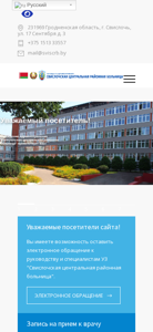 | AI-анализ | --- The portal Sviscrb.by is the official website of Svislochskaia TsRB (Svisloch Central District Hospital) in Belarus. It provides information on the hospital's administration, work regime, vacancies, history, ideological work, coordinating council, trade union, news, and policies regarding the handling of personal data. The website also features announcements on public organizations such as BRSM, Belaya Rus, the Council of Women, the Council of Veterans, the Red Cross, and work with youth. Other sections include health campaigns, labor protection, a hall of fame, achievements, photo gallery, and patient dispanserization for both adults and children. The website offers paid services, comprehensive examination programs, and information on driver's medical commission procedures and issuing medical reports. The hospital's policies on handling personal data and social support for families raising disabled children are also covered |