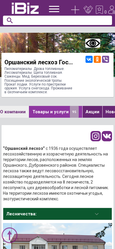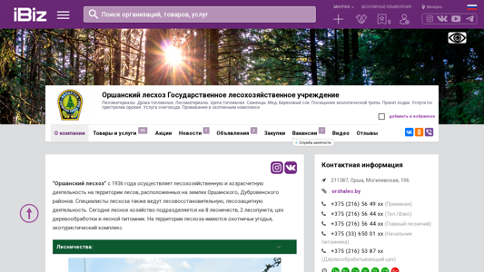 | Название / Заголовок | Оршанский лесхоз Государственное лесохозяйственное учреждение - Пиломатериалы. Дрова топливные. Лесоматериалы. Щепа топливная. Саженцы. Мед. Березовый сок. Посещение экологической тропы. Прокат лодки. Услуги по пристрелки оружия. Услуга снегохода. Проживание в охотничьем комплексе.. 211387, Орша, , Могилевская, 106 |