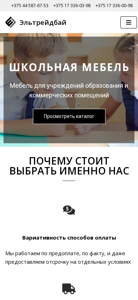 | AI-анализ | --- The website Eltreedbaй is a Belarusian e-commerce platform specializing in educational and school furniture. The title of the site is 'Эльтрейдбай'. The main keywords associated with the site include 'мебель' (furniture), 'каталог' (catalog), 'школьная' (school), and 'просмотреть' (view). The website offers a wide range of educational furniture for various purposes such as school desks, chairs, and cabinets. The site also provides furniture for dormitories, offices, and children's schools. Contact information for the company includes phone numbers '+375 44 587-67-53', '+375 17 336-03-98', and '+375 17 336-00-9 |