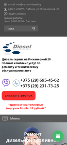 | AI-анализ | The portal Remont-Diesel.by is a website based in Minsk, Belarus, offering repair services for diesel vehicles. The main focus of the business is the affordable repair of light vehicles and microbuses. The company has its own evacuator and guarantees no hidden charges. The services include diagnosis and repair of diesel engines, Common Rail systems, and fuel pumps. The website provides information on the company, partnerships, certificates, and a map of the location on Ingeneerna Street 20. The business operates from Monday to Friday, 9:00 am to 6:00 pm, and Saturday and Sunday by appointment. The contact details include a phone number (+375 29 695-45-62 and +375 29 231-73-25) and an email address ( |
