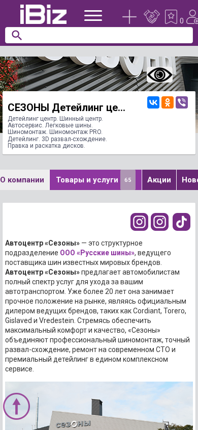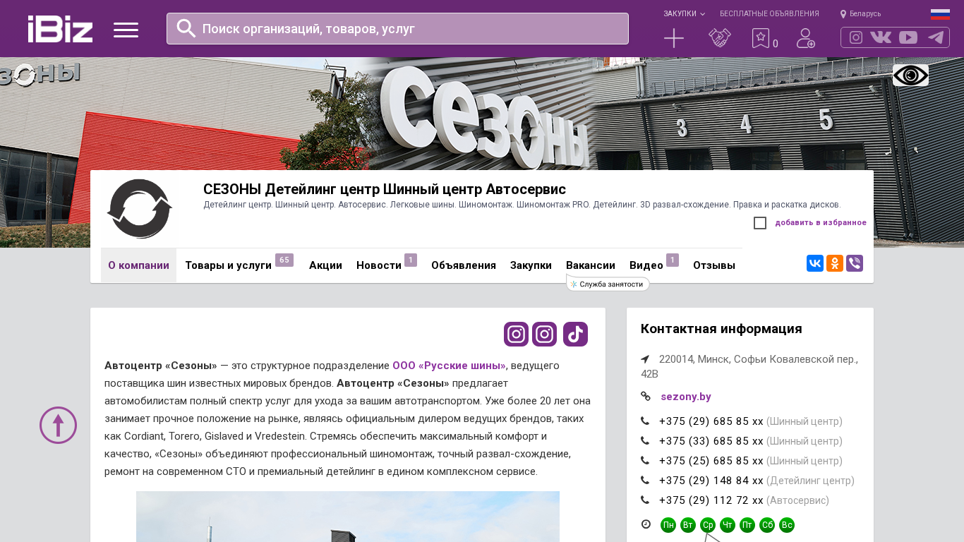 | Название / Заголовок | СЕЗОНЫ Детейлинг центр Шинный центр Автосервис - Детейлинг центр. Шинный центр. Автосервис. Легковые шины. Шиномонтаж. Шиномонтаж PRO. Детейлинг. 3D развал-схождение. Правка и раскатка дисков.. 220014, Минск, , Софьи Ковалевской пер., 42B |