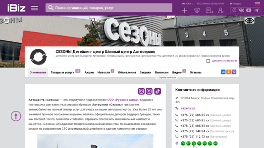 | AI-анализ | The portal Sezony.ibiz.by is a comprehensive auto service center located in Minsk, Belarus, at Sofiya Kovalevskaya Per. 42B. The business specializes in tire sales and mounting, as well as detailing services. Sezony.ibiz.by is part of OOO Russkie Shiny, a leading supplier of recognized global tire brands. With over 20 years of experience, the company has established itself as an official dealer for Cordiant, Torero, Gislaved, and Vredestein. Sezony.ibiz.by offers a full range of services for maintaining your vehicle, including professional tire mounting, precise tire alignment, auto repair in a modern garage, and premium detailing. The equipment used in the service adheres to the highest industry standards, ensuring the durability and safety of completed jobs. A personalized |