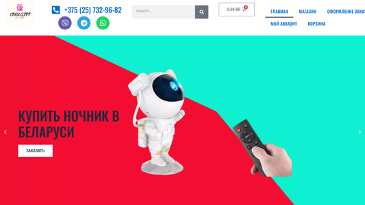 | AI-анализ | --- The website Coolgift.by is an online shopping platform selling various types of night lights in Belarus. Customers can purchase products such as a soft silicone rabbit night light, a floating globe night light, a 3D dinosaur night light, and a star projector night light. The website provides delivery services across Belarus through Belpochta or Europochta. Phone contact is available at +375 (25) 732-96-82. The homepage displays various night light options with their prices and a call-to-action button for placing orders. The website also mentions ongoing deals with discounts that are about to expire. Customers can use Viber, Telegram, or Whatsapp to contact the store. The top words on the website include 'cart', 'add', 'ночники', 'ночник', 'за |