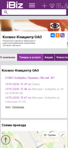 | AI-анализ | This online resource, titled "Космос-Комцентр ОАО," is an e-commerce website specializing in retail and wholesale trade of footwear and leather goods in Belarus. The company is located in Bobruysk at Пушкина, 198, каб. 307. The website provides contact information, including phone numbers for the office and two retail stores in Bobruysk. The Unified State Register of Enterprises number for the company is 700089686. The website features various categories of footwear and leather goods for sale, such as obuv, кожа, кожгалантерея, спортивные кроссовки, сапоги ботфорты, продажа туфель, and подарки из кожи. The business hours for the retail stores are from 09: |