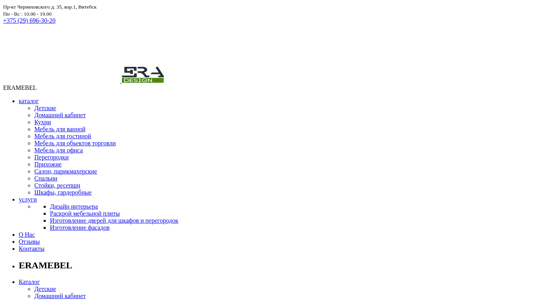 | AI-анализ | The web project Eramebel.by is a custom furniture manufacturing company based in Vitsebsk, Belarus. They offer custom-made body and built-in furniture for sale, with pleasant prices and installment plans. The company is located at Chernyakhovskogo street 35, corner 1, in Vitsebsk, and their operating hours are from 10:00 to 19:00. Customers can contact them at +375 (29) 696-30-20. The website showcases various categories of furniture, including children's, domestic, kitchen, bathroom, office, partitions, living room, reception desks, closets, and bedroom furniture, as well as interior design services and custom cabinetry. They offer a catalog for browsing and various services, such as design consultation, door and panel fabrication, and |