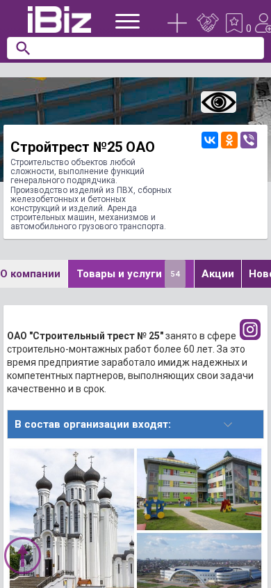 | AI-анализ | This website is for Stroytrest №25 OAO, a construction company based in Baranovichy, Belarus. The company provides construction services for projects of any complexity and acts as a general contractor. They also produce items from PVC, prefabricated and concrete structures and products. The website mentions rental services for construction machinery, mechanisms, and heavy cargo transportation vehicles. The company's address and contact information are provided. The website includes sections for company information, products and services, news, vacancies, and customer reviews on various social media platforms. The company, OAO "Stoiyelnyy trest №25," has been active in the construction industry for over 60 years and has built a reputation for reliable and competent partnerships that deliver quality work on time. The company comprises several divisions including Construction Management No. 145 (SU-1 |
