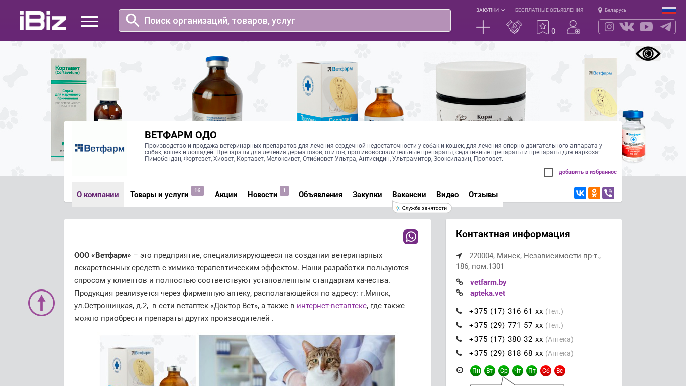 | Название / Заголовок | ВЕТФАРМ ОДО - Производство и продажа ветеринарных препаратов для лечения сердечной недостаточности у собак и кошек, для лечения опорно-двигательного аппарата у собак, кошек и лошадей. Препараты для лечения дерматозов, отитов, противовоспалительные препараты, седативные препараты и препараты для наркоза: Пимобендан, Фортевет, Хиовет, Кортавет, Мелоксивет, Отибиовет Ультра, Антисидин, Ультрамитор, Зооксилазин, Проповет.. 220004, Минск, , Независимости пр-т., 186, пом.1301 |