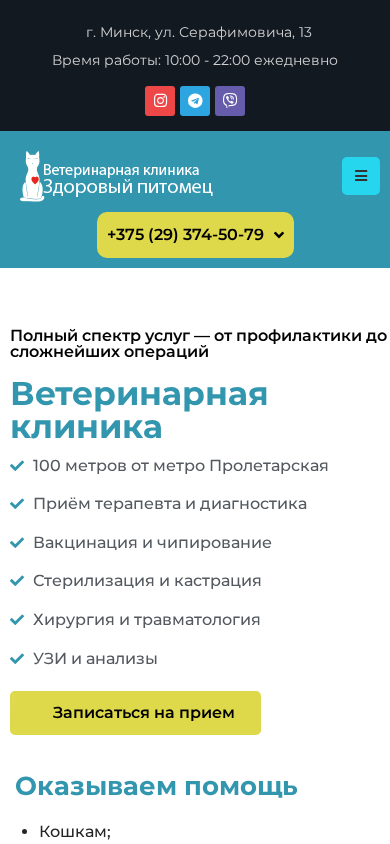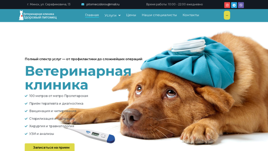 | AI-анализ | This online resource is a veterinary clinic named "Здоровый Питомец" located in Minsk, Belarus. The website offers professional help from veterinarians for dogs, cats, rodents, birds, and exotic animals. Services include vaccination, sterilization, surgery, oxygen therapy, and diagnostics. The clinic is open from 10:00 to 22:00 every day and can be contacted via Instagram, Telegram, or Viber. The full range of services covers preventative care to complex procedures. The clinic is a short walk from the Proletarian Metro Station. Animals treated include cats, dogs, rodents (hamsters, guinea pigs, rats, etc.), birds, and exotic pets (snakes, lizards, turtles, etc.). Clients can rest assured that their domestic pets will receive expert veterinary care. The |