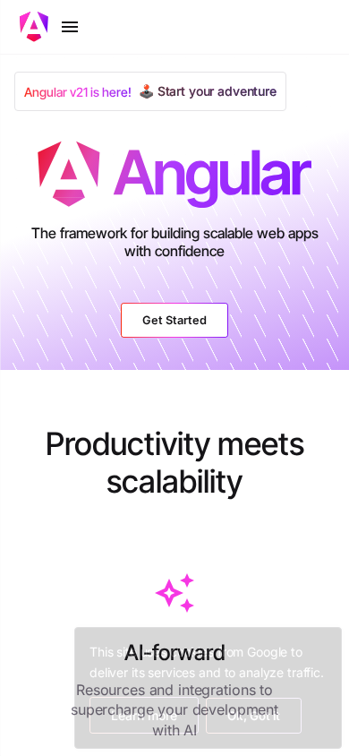 | AI-анализ | The website is the official home of Angular, a web development framework for building modern apps using TypeScript and offering features such as hydration, Signals, standalone components, accessibility, and performance. The site provides documentation, tutorials, and a playground for users to learn and experiment with Angular, as well as resources and integrations for AI-forward development. The framework is known for its productivity, scalability, and reactive design based on Angular Signals. It offers rendering strategies for meeting performance targets and first-party modules for forms, routing, and more. The site caters to developers of all skill levels, with tutorials for beginners and guides for those with framework experience. It also includes a blog and social media presence. |