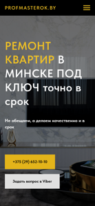 | AI-анализ | The website is dedicated to apartment repair services in Minsk, Belarus, offered by Profmasterok. The company specializes in both complete apartment renovations and individual repair jobs, with a track record of over 15 years of experience. Services include plumbing, electrical work, tiling, flooring installation, gypsum board construction, and more. Clients can request a quote and schedule a free on-site assessment. The website also provides a portfolio of completed projects and offers flexible pricing and payment plans. The company prides itself on its expertise, responsiveness, and commitment to maintaining cleanliness and order throughout the renovation process. Services are available in various locations, including D3, Grueshvka, Minsk-Mir, and Dzerzhynskiy 125. The website features a contact number, a call-to-action for requesting a quote, and links to social media |