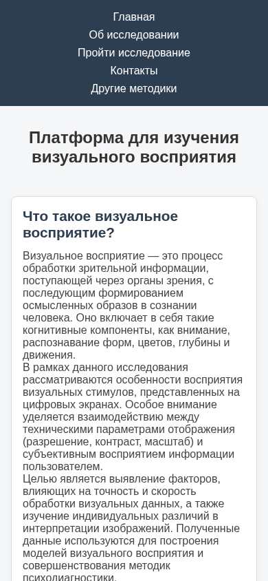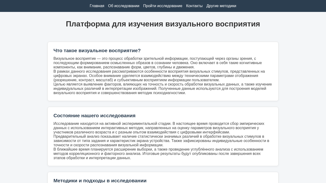 | AI-анализ | The website "tatti.by" is dedicated to researching visual perception. It includes information on the concept of visual perception, its components, and ongoing research in this area. The website focuses on the interaction between technical parameters of visual representation (resolution, contrast, scale) and subjective perception of information by users. The goal is to identify factors influencing the accuracy and speed of processing visual data and to study individual differences in interpreting images. Data obtained from the study are used to build models of visual perception and improve diagnostic methods. The research is currently in an active experimental phase, with the collection of empirical data using interactive methods aimed at evaluating participants of various ages and experience with digital interfaces. Preliminary analysis shows statistically significant differences in processing visual stimuli based on the type of task and screen characteristics of devices. Individual differences in precision and speed of recognizing visual information have also been identified. Future plans include expanding the sample |