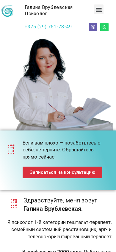 | AI-анализ | --- This website is a personal consulting service for Galina Vrublevskaya, a licensed psychologist and gestalt therapist. The site includes information about the psychologist, her approach to work, client testimonials, and contact information. Visitors can reach out to the psychologist directly for individual consultations. The main focus of the website is to help adults dealing with various life challenges, such as relationship issues, emotional and love dependencies, loss of identity, low self-esteem, excessive self-criticism, tension, anxiety, sadness, and feelings of isolation. The psychologist uses a supportive, thoughtful, emotionally warm, and tactful approach, incorporating techniques from various fields of psychology, including dialogical model of gestalt therapy, art therapy, body practices, and diagnostic elements of systemic family constellations. The site is available at vrublevskaya.by. |