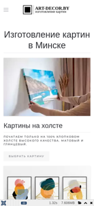 | AI-анализ | --- This website is a digital art gallery specializing in selling and showcasing various types of custom-made art pieces. The main sections of the site include 'Картины' (Cartinas), 'Модульные картины' (Modular paintings), and 'Контакты' (Contacts). The artworks are displayed in various formats such as on canvas, glass, and in frames. The site offers custom-made paintings in different sizes and quantities of modular units. The 'Картины на стекле' (Cartinas on Glass) section showcases minimalist designs, with only the reflection of the image on the glass surface. The 'Контакты' section provides information on how to order and purchase the artworks. The site is built using PHP and offers a catalog of art pieces in various categories including 'Абстракция' (Abstra |