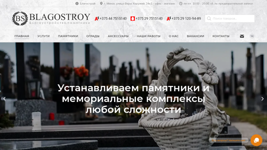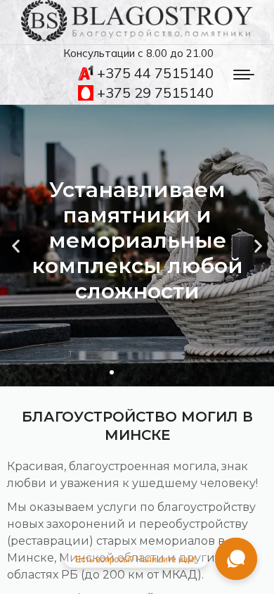 | AI-анализ | This website is about a business offering various services related to the upkeep and installation of memorial structures and cemeteries in Minsk, Belarus. The title of the website is "Благоустройство могил в Минске цены и фото" (roughly translating to "Cemetery Improvement in Minsk Prices and Photos") and the description includes keywords such as "ограды" (fences), "памятники" (monuments), "реставрация" (restoration), "укладка" (laying), and "декоративное покрытие" (decorative covering). The website provides consultation services from 8:00 to 21:00 and can be reached through several phone numbers. The main services offered include the installation of monuments and memorial complexes, the installation of fences, the |