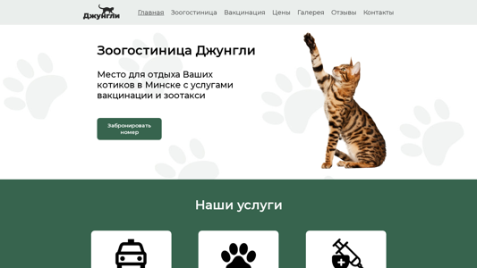 | AI-анализ | The web project "Zoohotel.by" is a cat and kitten boarding house in Minsk, Belarus, named "Zoohotel Dzhungli". The website offers a place for cats and kittens to rest in Minsk, along with services such as vaccination and zootaxi. The project includes a main page, a vaccination page, a pricing page, a photo gallery, customer reviews, and contact information. The zoo hotel is open 24 hours a day and offers various services for cat owners, including transfer services for animals (zootaxi), vaccination, and a place to stay for cats. The website also includes information about the zoo hotel, its staff, and the benefits of leaving a cat at the zoo hotel. The domain name is "zoohotel.by". |