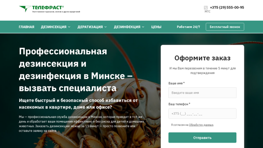 | SEO-описание | Центр дезинфекции в Минске. Профессиональная дезинсекция от тараканов, клопов, клещей. Дезинфекция помещений, школ, столовых, офисов. Закажите услугу по телефону. |