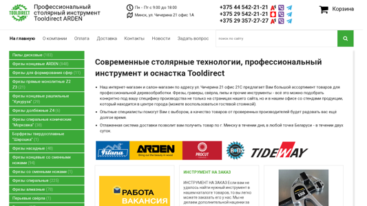| AI-анализ | This website is an e-commerce platform and physical store named Tooldirect, located in Minisk, Belarus, at ul. Chycherina 21, office 1A. They offer a wide range of professional woodworking tools and equipment, including various types of Arden and Procut endmills, drill bits, saws, grinders, and other accessories. The store's hours of operation are from 9:00 AM to 6:00 PM on weekdays. Customers can contact the store via phone numbers +375 44 542-21-21, +375 29 542-21-21, and +375 29 357-27-27. The catalog includes over 500 items, such as disc saws, conical end |