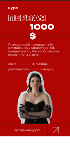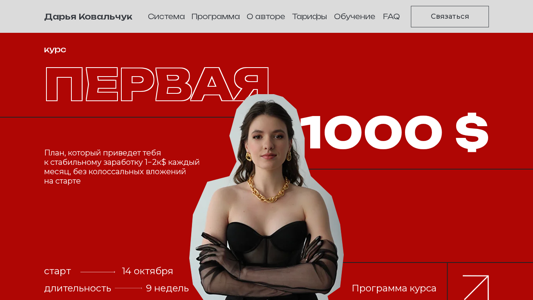 | AI-анализ | This website, realmoney.by, is titled "Курс "Первая 1000 $" (First Thousand Dollars Course) and offers a program for making stable monthly income of 1-2 thousand dollars without large initial investments. The course, created by Darya Kovalchuk, is scheduled to start on October 14 and lasts for nine weeks. The website provides information on the author, tariffs, and FAQ, and mentions the creation of an online store with a starting investment of 200 dollars that can generate the first earnings during university studies. The program includes strategies for leaving an unloved job and creating a business that brings pleasure and profit, as well as the implementation of tools for stable sales of 3-5 items per day without working 10 hours a day. The course is targeted at various professionals, including mothers on maternity |