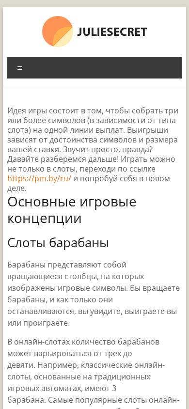 | AI-анализ | The website "Как играть в слот-игры — гайд для новичков" on juliesecret.by provides a guide for beginners on how to play slot games. In slot games, the objective is to collect three or more symbols (depending on the type of slot) on one payline to earn a win. Wins depend on the value of the symbols and the size of your bet. The gameplay is simple: spin the reels, and when they stop, you will know if you have won or lost. Slot machines consist of rotating drums, or reels, which display game symbols. The number of reels can vary from three to nine. Classical online slots typically have three reels, while popular ones have five. The payline is a line or combination of symbols that determines the winning pattern in a slot machine. When a winning combination appears on the payline, |