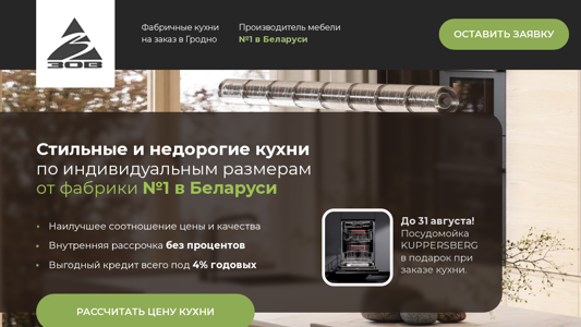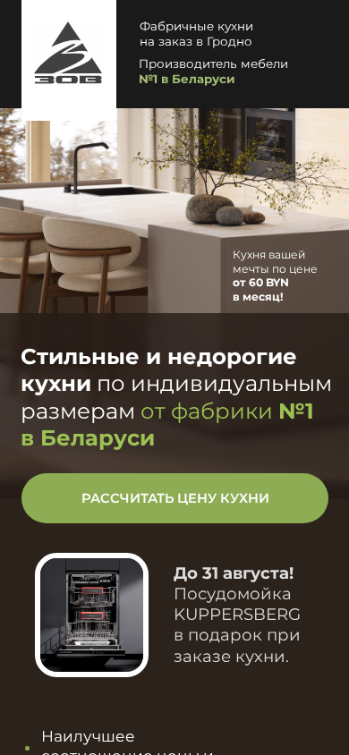 | AI-анализ | --- The web project "ЗОВ - Кухни №1 в Беларуси 2024" offers stylish and affordable kitchens in individual sizes from Factory №1 in Belarus. The project is based in Grodno and allows visitors to place a request for factory kitchens made to order. The kitchen of your dreams is available starting from 60 BYN per month. The producer of furniture in Belarus with a 25+ year track record, "ЗОВ-ЛенЕВРОМЕБЕЛЬ," guarantees a wide range of materials and hardware, as well as professional installation with minimal dust and noise. An attractive offer includes a free KUPPERSBERG dishwasher with a kitchen purchase. The company's address is located at г. Гродно, ул. Дзержинского, 110, and |