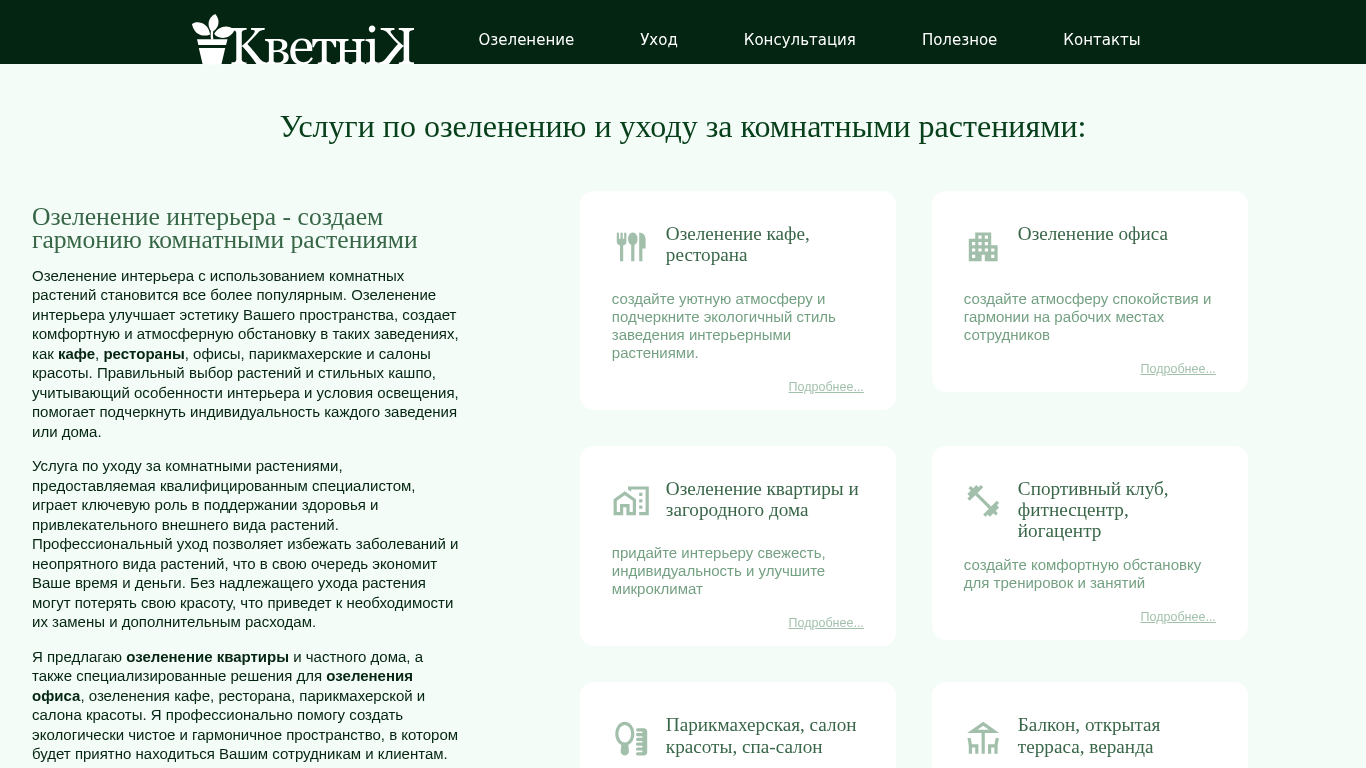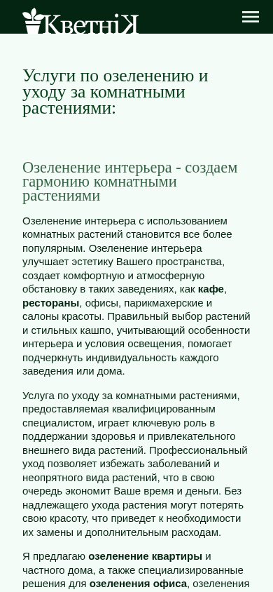 | SEO-описание | Услуги по озеленению комнатными растениями, фитодизайн интерьера: озеленение ресторанов, кафе, дома, квартиры, офиса, балкона, террасы, веранды, уход за комнатными растениями |