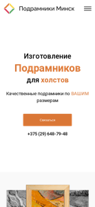| AI-анализ | The website is a master workshop in Minsk, Belarus, specializing in the production and sale of custom-made frames and underframes for various types of fabrics or canvases. The title of the site is "Подрамники для холстов - купить в Минске," which translates to "Frames for Canvas - Buy in Minsk." The description tag includes keywords such as "модульные подрамники," or "modular frames," "подрамники для холста," or "frames for canvas," "подрамники для холстов," or "frames for fabrics," and "минск," or "Minsk." The top words in the text include "подрамники," or "frames," "спосибо," or "thank you," "375," which is the country code for |
