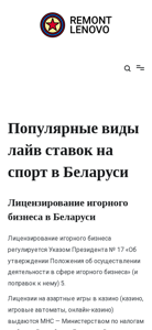 | AI-анализ | --- The portal remont-lenovo.by provides information about popular live bets on sports in Belarus. It also mentions licensing requirements for casino businesses in Belarus, which are regulated by the Presidential Decree No. 17 and supervised by the Ministry of Taxes and Fees of the Republic of Belarus. The website offers details on obtaining casino licenses, including the need for a base unit fee of 12,750 rubles (approximately 4300 euros), the requirement for all gaming equipment to be certified, and the stipulation that only legally registered entities in the country are allowed to operate in the gambling industry. The site is also available in English. Casino licenses are valid for ten years, and a maximum of 32 licenses can be issued. Requirements for obtaining a casino license include a base unit fee, certification of all gaming |