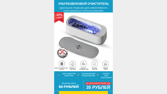 | AI-анализ | The website is an e-commerce store specializing in selling an ultrasonic cleaner, described as an "ideal solution for effective daily use." The product offers a -32% discount and a 100% quality guarantee. The ultrasonic cleaner is suitable for cleaning various items such as eyeglasses, jewelry, makeup brushes, and manicure tools. Its ultrasonic technology ensures a safe and gentle impact on materials. The compact design and battery-operated functionality make it ideal for travel. The purchasing process includes filling the bath with water, adding cleaning solution, and turning on the device. This practical device adds convenience to daily life and emphasizes attention to details in caring for one's accessories. The shipping and payment details include delivery by BelPost within 2-5 days and payment upon receiving the product. The store guarantees 100% product quality and ensures compliance |