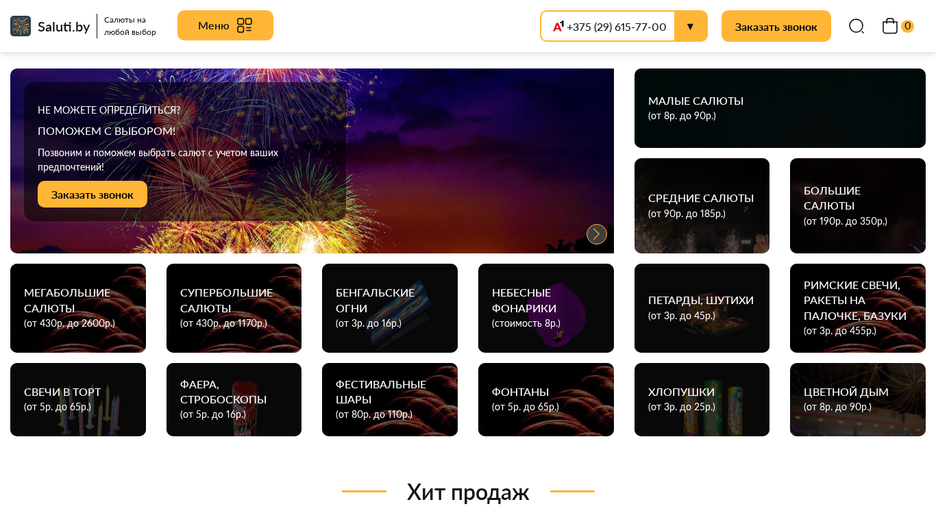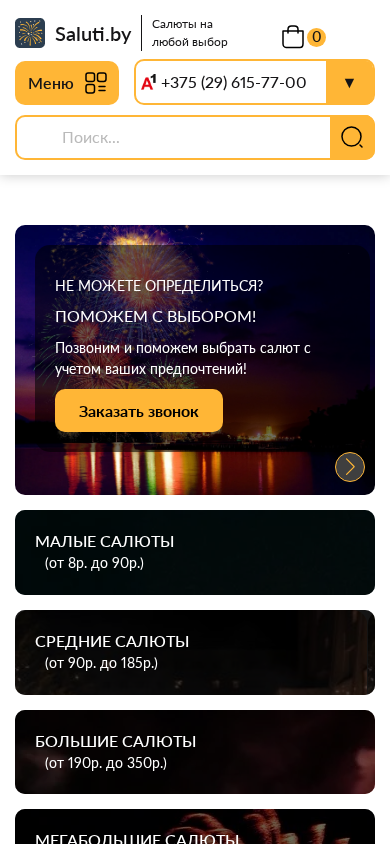 | AI-анализ | --- The portal Saluti.by is an e-commerce website selling fireworks and salutes in Minsk, Belarus, and the region at affordable prices with a quality guarantee. The extensive assortment allows customers to choose the ideal pyrotechnics for any occasion. Users can explore the options and place an order with delivery right away! The website offers a variety of fireworks, from small ones priced at 3 Belarusian rubles to mega-sized ones costing up to 2,600 Belarusian rubles. Other products include Bengal lights, sparklers, rockets on sticks, roman candles, colored smoke, and various fireworks accessories. The website provides video previews for some items and allows users to add items to their cart or call for assistance in making a selection. The contact information includes phone numbers for two different offices, but no email or physical address is |