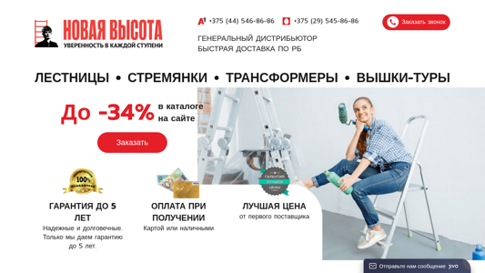 | AI-анализ | The portal Stremyanka.by offers a wide range of ladders, transformers, and other special items for various purposes such as home, cottage, agricultural enterprises, construction and repair, production, logistics terminals, and warehouses. The website features different series of products including the 100 series with light and sturdy aluminum and composite steps with a maximum load capacity of 150 kg, the 200 series for semi-professional use with a load capacity of 150-180 kg, the 300 series for professional use with a load capacity of 225 kg, and the 500 series for professional and industrial use with a maximum load capacity of 200 kg/m2 (400 kg on the platform). All products come with respective warranties ranging from one to five years. The site also offers |