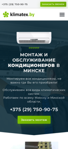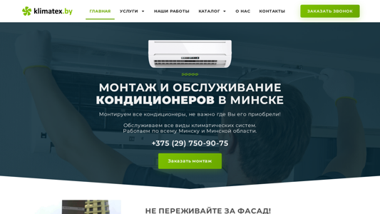 | AI-анализ | This website is about the installation and service maintenance of air conditioners in Minsk. The title and description mention that they will install air conditioners in apartments in Minsk and provide service maintenance for existing air conditioners. The phone number +375 (29) 750-90-75 is listed for making a call. The main sections of the website are "Montazh kondiicioneров" (Montaj of conditioners), "Servisnoe obsluzhivanie" (Service maintenance), "Nashi raboty" (Our works), "Katalog" (Catalog), "O nas" (About us), and "Kontakty" (Contacts). The website offers installation of all types of air conditioners regardless of the brand and promises to work all over Minsk and the Minsk region. They also offer a decorative trim for |
