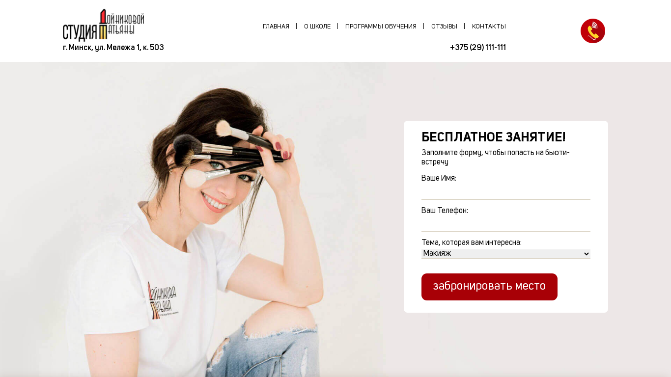 | AI-анализ | This website is for Lissa School, a beauty studio located in Minsk, Belarus, at ul. Melezh 1, apt. 503. The studio offers various programs for learning makeup artistry, hairstyling, and brow correction and coloring. The title of the website is "Студия Татьяны Дойниковой" (Studio Tatiana Doynikova) and it includes sections on the school, its programs, and individual testimonials. Keywords associated with the website include "prepodavatel" (teacher), "uvrozhennyy" (mature), "vizhizist" (makeup artist), "prizhki" (hairstyles), "bazovyy" (basic), "brovei" (eyebrows), "tatiyana" (Tatiana), "doy |