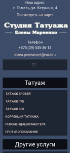 | AI-анализ | This website is for a permanent makeup studio named "Елены Мариенко" located in Gomel, Belarus. The title of the website includes the phrase "перманентный макияж," which translates to "permanent makeup," and the description states that the studio offers this service using professional techniques for the eyes, brows, and lips. The studio, named "Arcoer," guarantees sterility and high-quality work. The website includes a phone number and an email address for contact information. Keywords related to the business include "permanent makeup," "permanent makeup in Gomel," "studio permanent makeup," "studio tattoo Arcoer," and "tattoo salon in Gomel." Top words on the website include "tattoo," "permanent," "makeup," "studio," "master," "brows," |