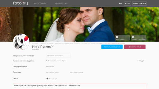 | AI-анализ | --- The portal ingrin.foto.by showcases the portfolio of photographer Inga Popova from Molodeчно, Belarus. The main focus of the website is on her work in the "Свадебная фотосъемка" (Wedding Photography) category, but she also offers services for "детская фотосъемка" (Children Photography) and "портретная фотосъемка" (Portrait Photography). The photographer's contact information is provided for the cities of Molodecnco. The website also includes a community for photographers and a blog. According to the data, there are no reviews available for this photographer on the site. The photographer's personal website can be found at ingrin.foto.by. |