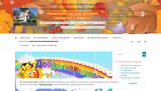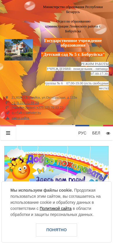 | AI-анализ | The website is for Kindergarten No. 5 in Bobruisk, Belarus, under the Ministry of Education of the Republic of Belarus and the education administration of the Leninsky district in Bobruysk. The kindergarten is a state educational institution named "Детский сад № 5 г. Бобруйска" and follows a regular working schedule from Monday to Friday, 7:00-17:30, with an extended schedule for group 6 from Monday to Friday, 7:00-19:00. The contact information includes the address 213826, Bobruisk, ul. Oktyabrskaya, d.123a, and phone numbers +375 225 70 83 23 (hotline) and +375 225 70 |